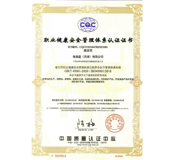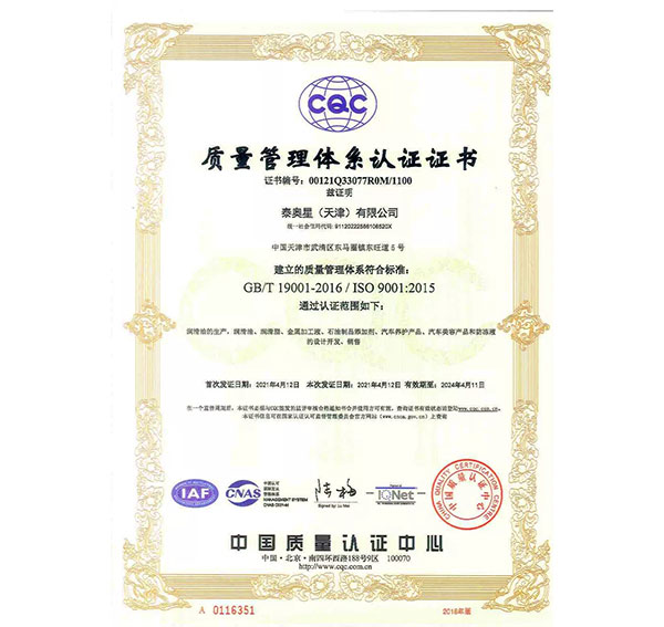 多年來,泰奧星堅持質(zhì)量至上的經(jīng)營理念,先后通過了ISO9001質(zhì)量管理體系、ISO14001環(huán)境管理體系和、OHSAS18001職業(yè)健康安全管理體系及IATF16949質(zhì)量管理體系四大體系認(rèn)證。嚴(yán)格的質(zhì)量控制體系保障了公司產(chǎn)品質(zhì)量穩(wěn)定優(yōu)良,近年來,泰奧星先后被認(rèn)定為CMMC中國潤滑材料行業(yè)十強、全國潤滑十佳企業(yè)、中國綠色低碳先鋒企業(yè)等。