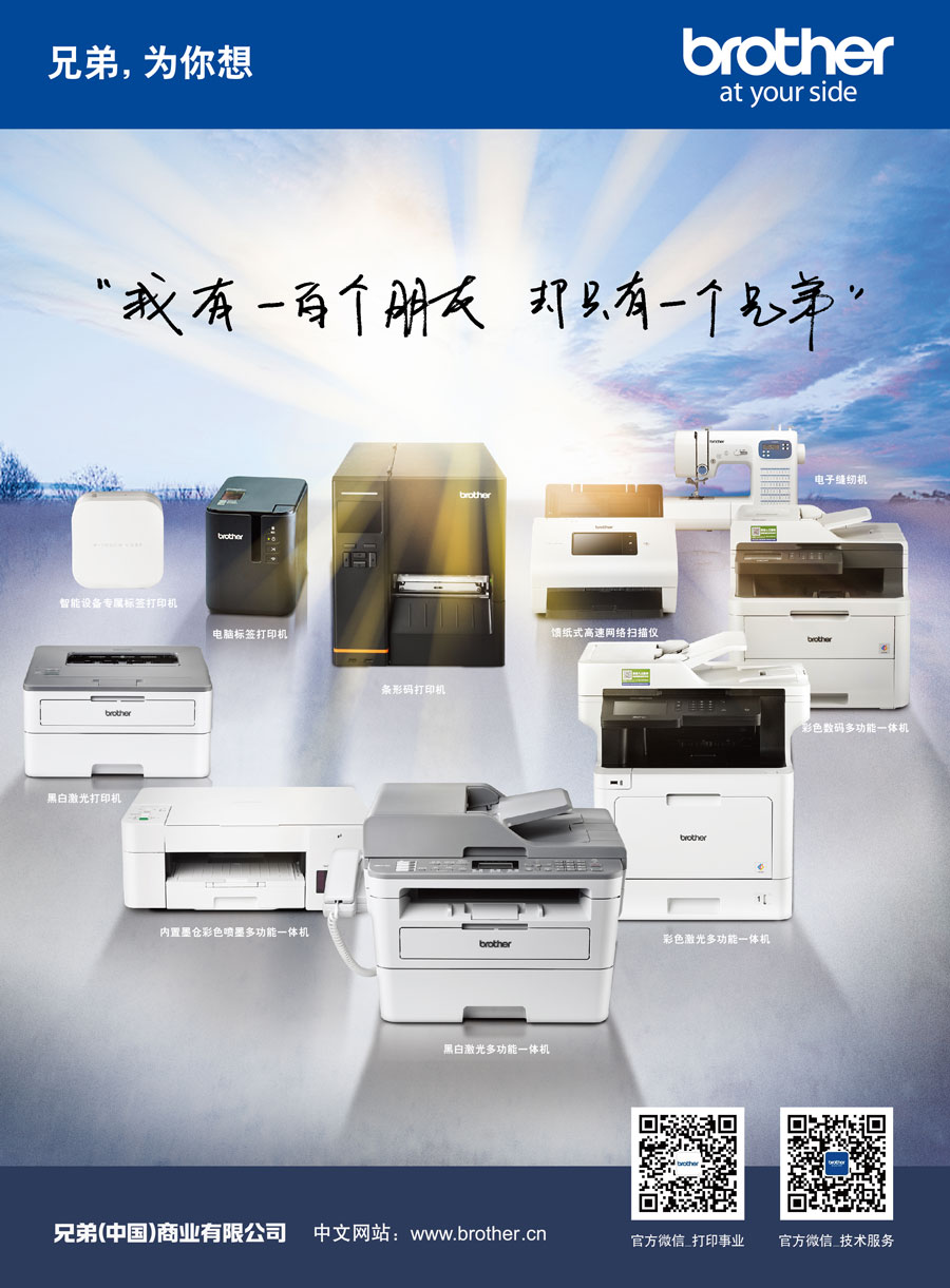 Brother作為擁有110多年歷史的國(guó)際化品牌,目前已在全球40個(gè)以上的國(guó)家和地區(qū)擁有研究開(kāi)發(fā)基地、生產(chǎn)基地以及銷(xiāo)售公司。作為Brother集團(tuán)在中國(guó)的產(chǎn)品銷(xiāo)售與服務(wù)的外商獨(dú)資企業(yè),兄弟(中國(guó))充分利用集團(tuán)的資源優(yōu)勢(shì),秉承“At your side.”的企業(yè)文化理念,遵循顧客第一的宗旨,傾聽(tīng)顧客的呼聲,為中國(guó)消費(fèi)者提供更多具有高附加值的產(chǎn)品和服務(wù)。兄弟(中國(guó))的事業(yè)領(lǐng)域包括以打印機(jī)、多功能一體機(jī)、傳真機(jī)、標(biāo)簽打印機(jī)、掃描儀等產(chǎn)品為代表的打印及解決方案事業(yè);以家用縫紉機(jī)、商用繡花機(jī)、電腦花樣裁切機(jī)為中心的家用機(jī)器事業(yè)。
