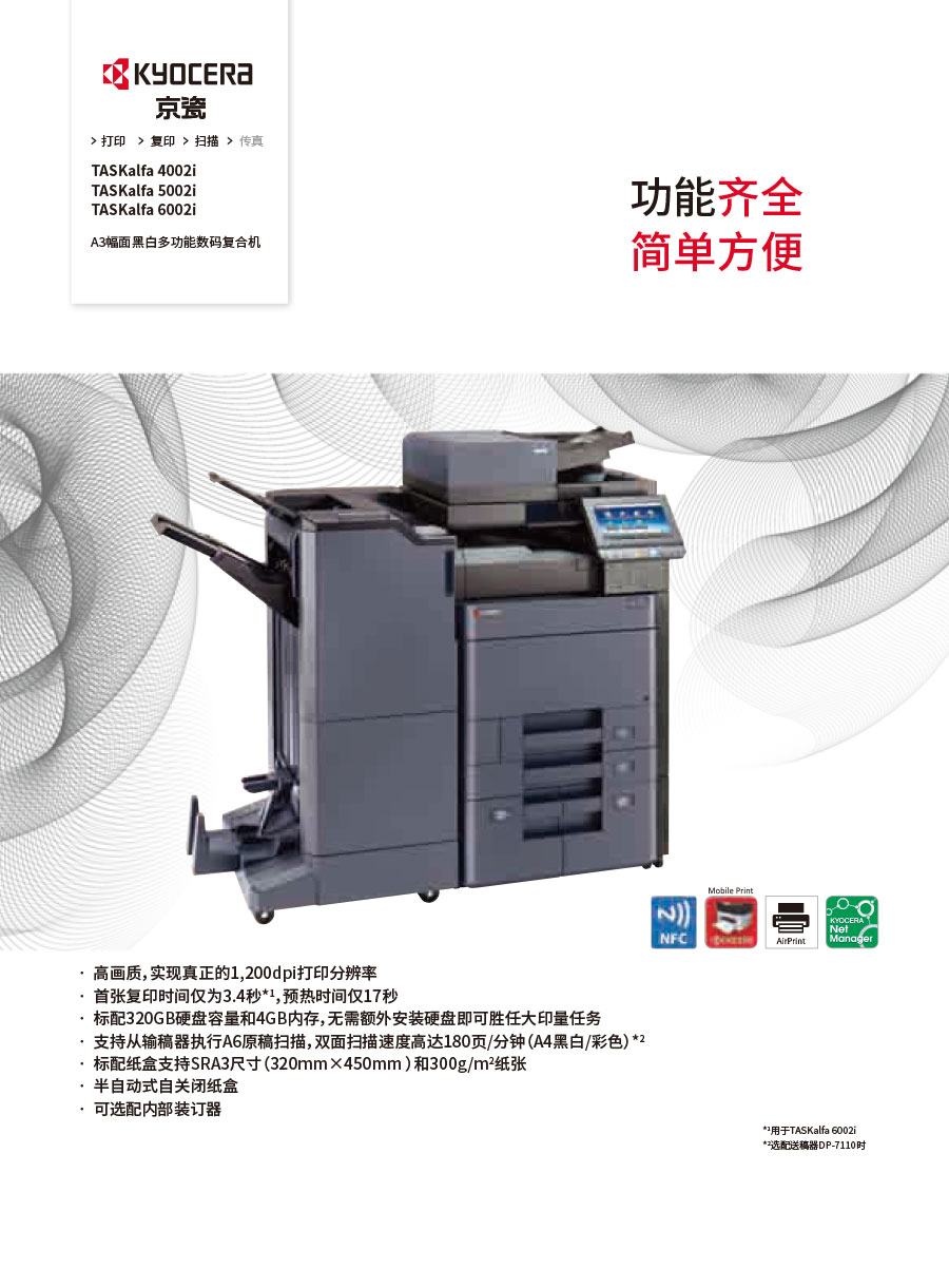 主要產(chǎn)品:KYOCERA京瓷激光打印機(jī),一體機(jī),復(fù)合機(jī),生產(chǎn)型彩色噴墨數(shù)碼印刷系統(tǒng)及辦公信息系統(tǒng)的開發(fā)、設(shè)計、系統(tǒng)集成