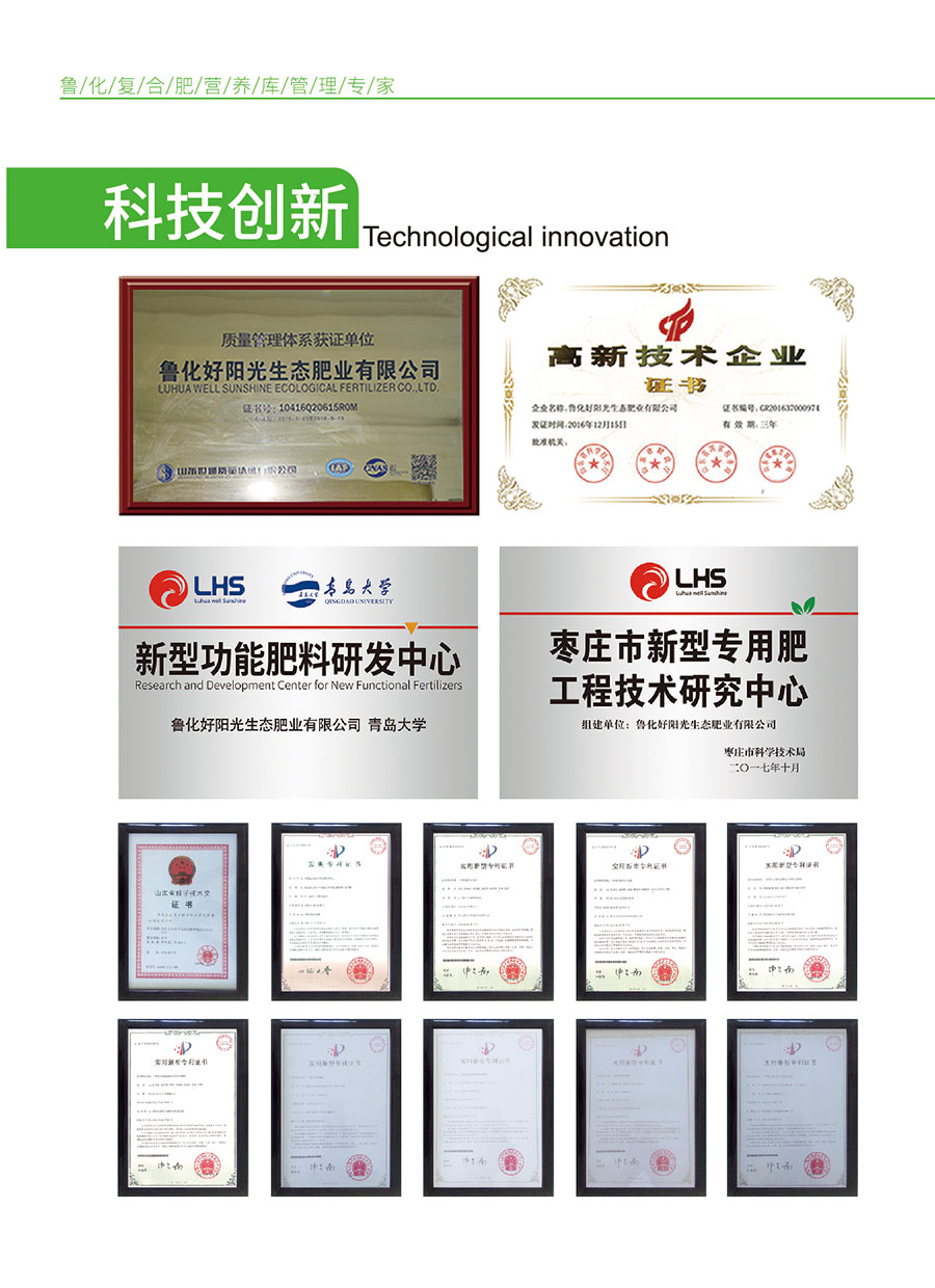 魯化好陽光秉承“營養(yǎng)庫管理專家”的理念,致力于肥料的高效利用,服務(wù)農(nóng)業(yè)生產(chǎn)。魯化好陽光已獲得國家高新技術(shù)企業(yè)認(rèn)證、ISO9001質(zhì)量體系認(rèn)證等多項(xiàng)管理資質(zhì)證書。和青島大學(xué)、滕州市馬鈴薯品牌培育產(chǎn)業(yè)發(fā)展研究所等多所大學(xué)、研究機(jī)構(gòu)合作,建立新型肥料研發(fā)中心,取得了豐碩成果。