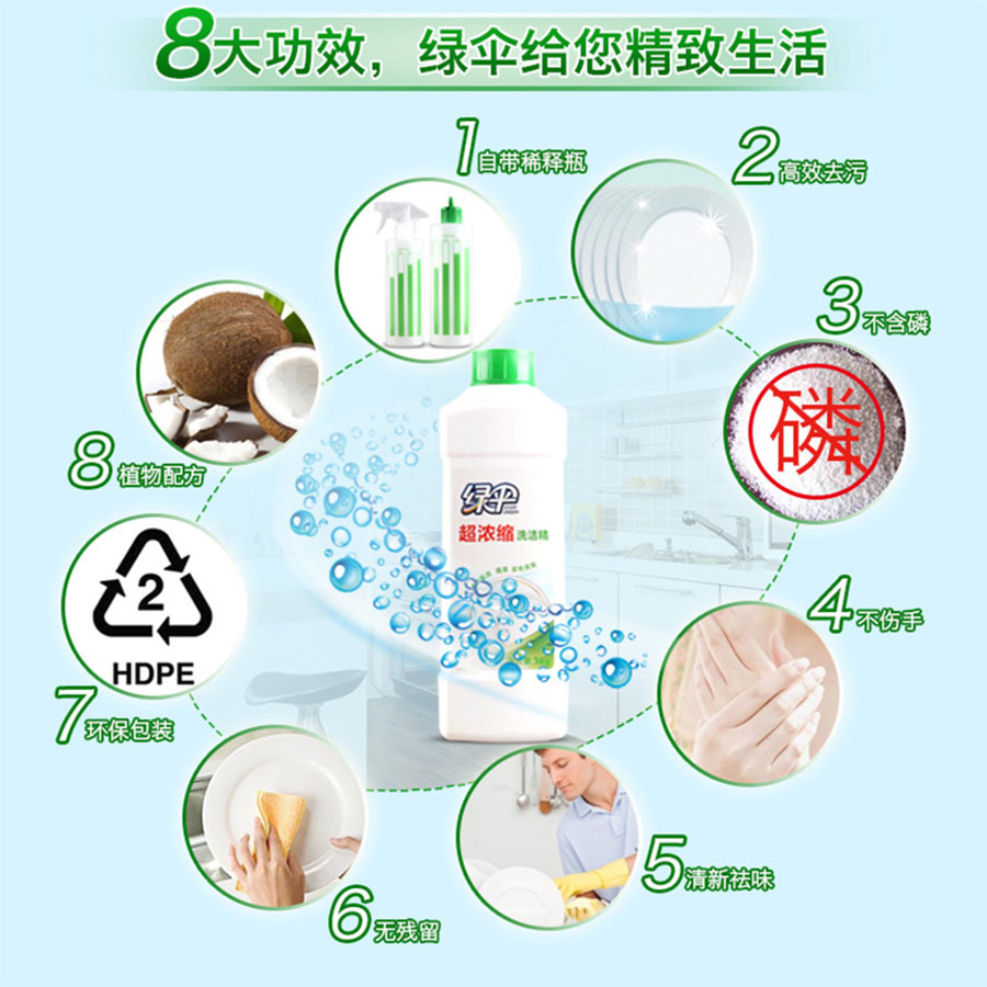主要產(chǎn)品:綠傘、綠蕊、小閑牌洗衣液系列、油煙凈系列、洗潔精系列;廁潔系列;玻璃地板清潔系列;洗手液系列;消毒液系列、智能刷系列等