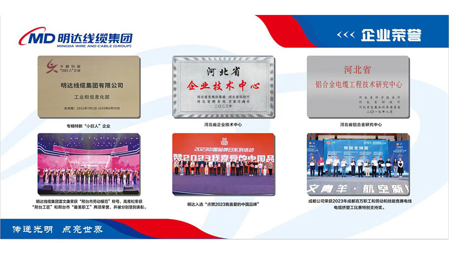 明達線纜先后被評為中國線纜企業(yè)百強、礦用橡套電纜企業(yè)十強、中國最具投標實力電線電纜供應商百強,國家高新技術企業(yè)、國家級專精特新小巨人企業(yè)、國家守合同重信用企業(yè)、全國質(zhì)量誠信示范企業(yè)、點贊2023我喜愛的中國品牌、全國用戶滿意星級產(chǎn)品、河北省民營企業(yè)百強、河北省誠信企業(yè)、河北省產(chǎn)業(yè)集群龍頭企業(yè)、河北省企業(yè)技術中心、河北省制造業(yè)單項冠軍(鋁合金電纜)、河北省企業(yè)標準領跑者、河北省級標準化良好行為試點企業(yè)、河北省安全生產(chǎn)標準化企業(yè)、邢臺市政府質(zhì)量獎、邢臺市智能電網(wǎng)及輸配電裝備產(chǎn)業(yè)鏈鏈主企業(yè)、邢臺市電線電纜協(xié)會會長單位等多項資質(zhì)榮譽。