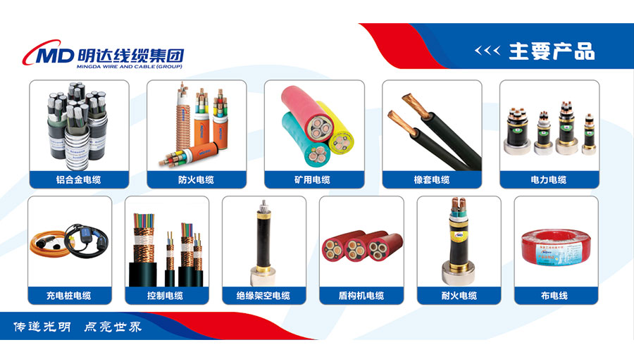 主要產(chǎn)品:“明達”牌鋁合金電纜、防火電纜、礦用電纜、橡套電纜、電力電纜、充電樁電纜及連接裝置、控制電纜、布電線、架空絕緣電纜、盾構(gòu)機電纜、耐火電纜等線纜產(chǎn)品