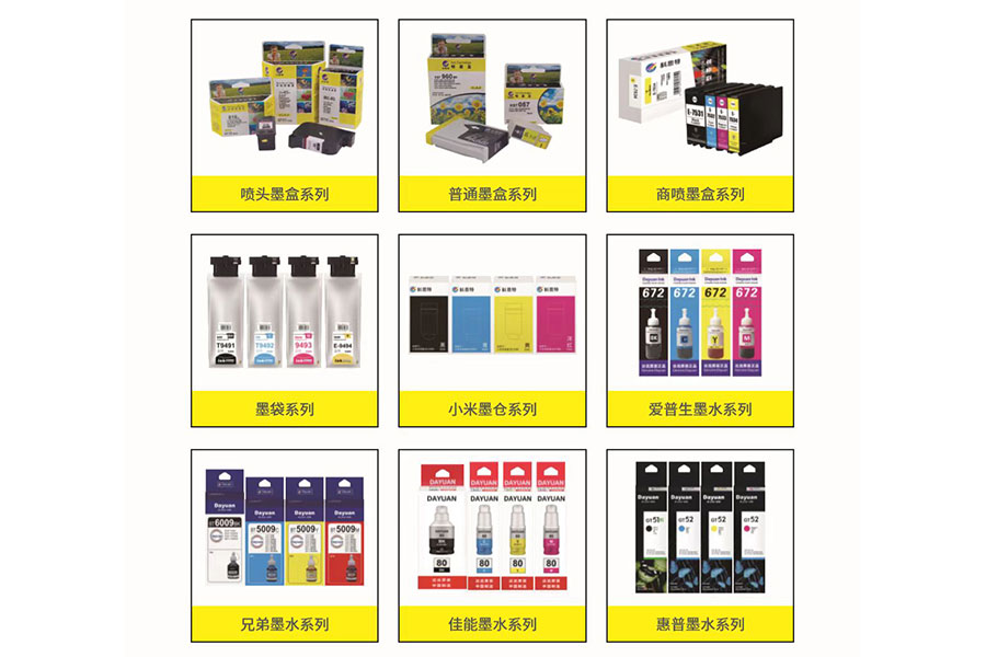 1.打印機耗材:硒鼓、粉盒、鼓架、碳粉,噴頭墨盒、普通墨盒、商噴墨盒、墨袋、墨水,色帶架、色帶芯。