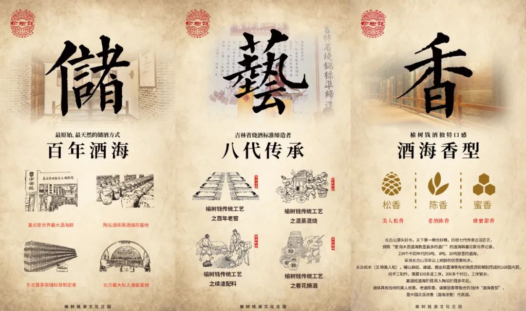 好的品牌需要好的品質(zhì)作為支撐。長白山源頭好水,天下第一糧倉好糧,歷經(jīng)八代傳承古法匠藝,234個不同年代的酒海,采用長白山百年以上樹齡的優(yōu)質(zhì)黃松木,長白松木(又稱美人松),輔以麻紙、蜂蠟、鹿血和蛋清等有機物質(zhì)調(diào)和糊制而成的168層內(nèi)膽,純手工制作,需要100多道工序,300多個時日,工序繁雜,基酒經(jīng)酒海貯藏再入陶壇貯藏多年后,酒體則具有獨特的美人松香、老酒陳香、蜂蜜甜香,是榆樹錢酒業(yè)獨特的“酒海香型”。