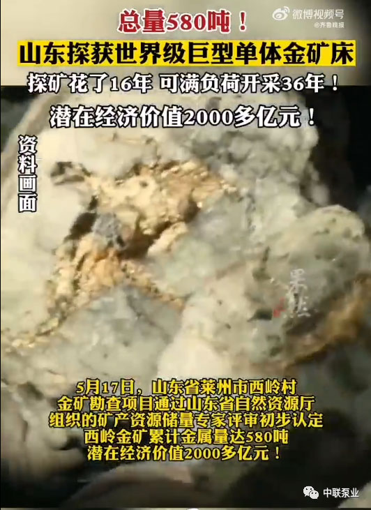 山東萊州市西嶺村金礦勘查項(xiàng)目通過(guò)省自然資源廳組織的儲(chǔ)量專(zhuān)家評(píng)審,初步認(rèn)定西嶺金礦新增金金屬量近200噸,累計(jì)金金屬量達(dá)580噸,潛在經(jīng)濟(jì)價(jià)值2000多億元,是迄今為止國(guó)內(nèi)發(fā)現(xiàn)的最大單體金礦床。