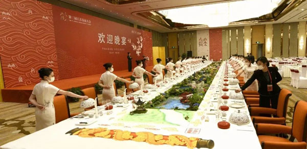 根據(jù)省委提出的“務(wù)實(shí)、高效、安全、節(jié)儉”的辦會(huì)原則,集團(tuán)在對(duì)上兩屆大會(huì)晚宴接待工作全面復(fù)盤的基礎(chǔ)上,將傳統(tǒng)宴會(huì)服務(wù)與個(gè)性化服務(wù)相結(jié)合,創(chuàng)新細(xì)化工作方案,嚴(yán)明工作紀(jì)律要求。根據(jù)“統(tǒng)分結(jié)合”模式,實(shí)施“清單化管理、項(xiàng)目化推進(jìn)、制度化保障”,確保層層有人抓、事事有人管、件件能落實(shí)。在用品用具調(diào)配上,本著“能儉不奢、能用不換”的原則,集團(tuán)對(duì)上兩屆大會(huì)晚宴的服裝、餐具等用品用具進(jìn)行了全面梳理和盤點(diǎn),做到物盡其用、拾遺補(bǔ)缺、簡(jiǎn)樸節(jié)省;在食材選擇和菜肴出品上,就地取材、應(yīng)時(shí)而獲、因材烹制,以水韻江蘇“江河湖海”相串聯(lián),“傳統(tǒng)菜、時(shí)令菜、地標(biāo)菜、創(chuàng)新菜”四菜合一,體現(xiàn)江蘇的地域性、淮揚(yáng)菜“色香味形”的統(tǒng)一性、綠色有機(jī)食材的鄉(xiāng)土性、安全性和人文典故與經(jīng)典傳承的文化性,給嘉賓帶來視覺與味覺的雙重盛宴。尤其值得一提的是,晚宴注重提煉展示江蘇地域文化精髓,堅(jiān)持創(chuàng)造性轉(zhuǎn)化、創(chuàng)新性發(fā)展,如前菜設(shè)計(jì)上巧妙融入了贊美江蘇的經(jīng)典詩詞,紙是糯米紙,墨是墨魚汁,筆是巧克力,筆架是如意糖,創(chuàng)新餐飲文化表達(dá)方式,引發(fā)了鄉(xiāng)情共鳴,彰顯了文化自信,嘉賓們紛紛贊嘆金陵“細(xì)微之處見功夫”。
