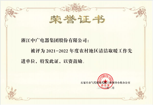 日前,浙江中廣電器集團(tuán)股份有限公司榮獲由石家莊市氣代煤電代煤工作領(lǐng)導(dǎo)小組辦公室授予的“2021-2022年度農(nóng)村地區(qū)清潔取暖工作先進(jìn)單位”榮譽(yù)稱號,以此表彰以中廣電器集團(tuán)在當(dāng)?shù)剞r(nóng)村地區(qū)清潔取暖工作中所作出的杰出貢獻(xiàn)。