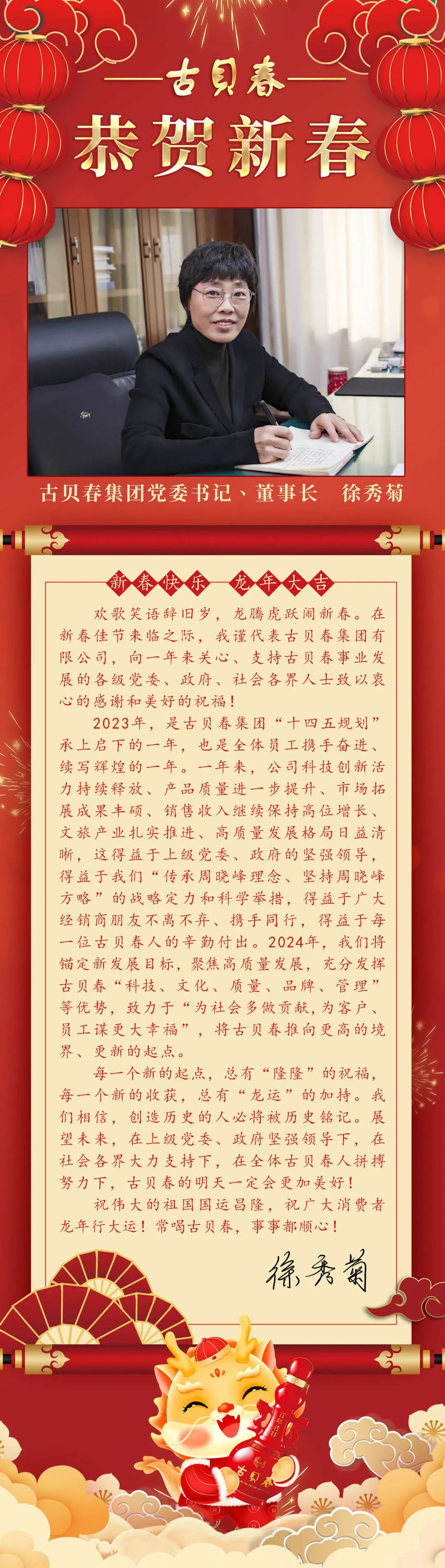 古貝春集團(tuán)有限公司黨委書記、董事長(zhǎng)徐秀菊攜全體員工恭祝全國人民新春快樂!