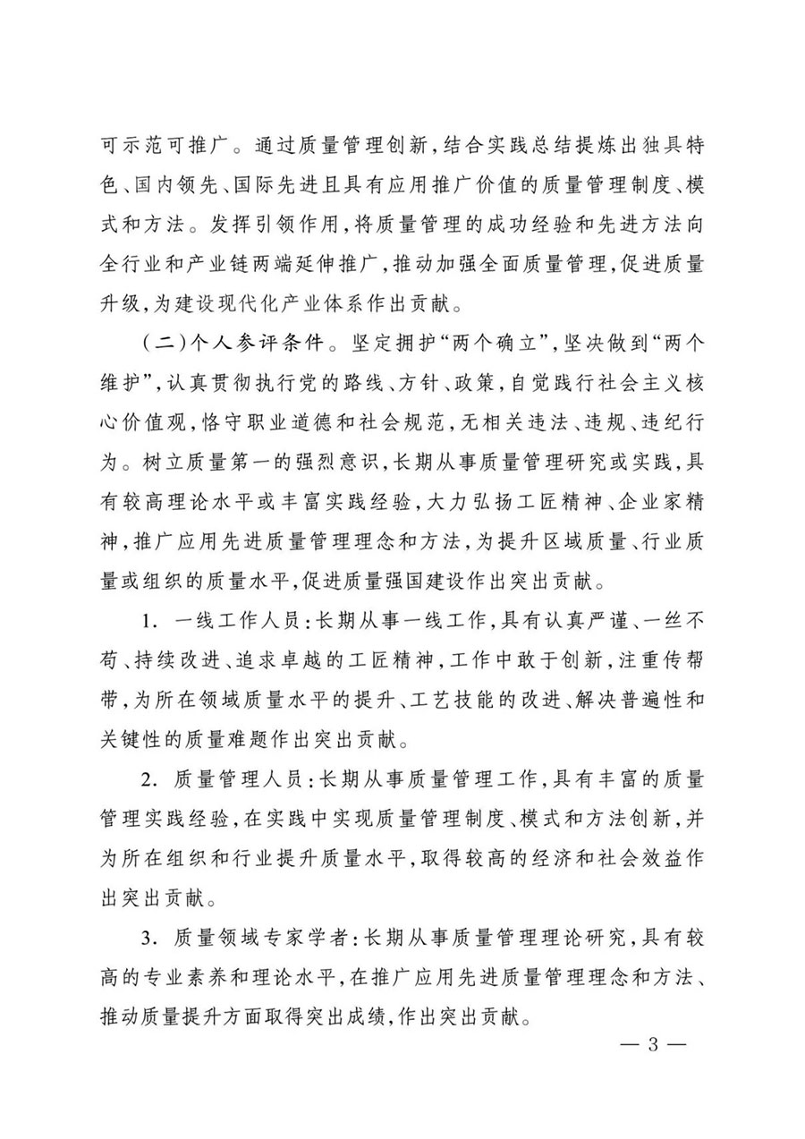 (二)個人參評條件。堅定擁護“兩個確立”,堅決做到“兩個維護”,認真貫徹執(zhí)行黨的路線、方針、政策,自覺踐行社會主義核心價值觀,恪守職業(yè)道德和社會規(guī)范,無相關(guān)違法、違規(guī)、違紀行為。樹立質(zhì)量第一的強烈意識,長期從事質(zhì)量管理研究或?qū)嵺`,具有較高理論水平或豐富實踐經(jīng)驗,大力弘揚工匠精神、企業(yè)家精神,推廣應(yīng)用先進質(zhì)量管理理念和方法,為提升區(qū)域質(zhì)量、行業(yè)質(zhì)量或組織的質(zhì)量水平,促進質(zhì)量強國建設(shè)作出突出貢獻。