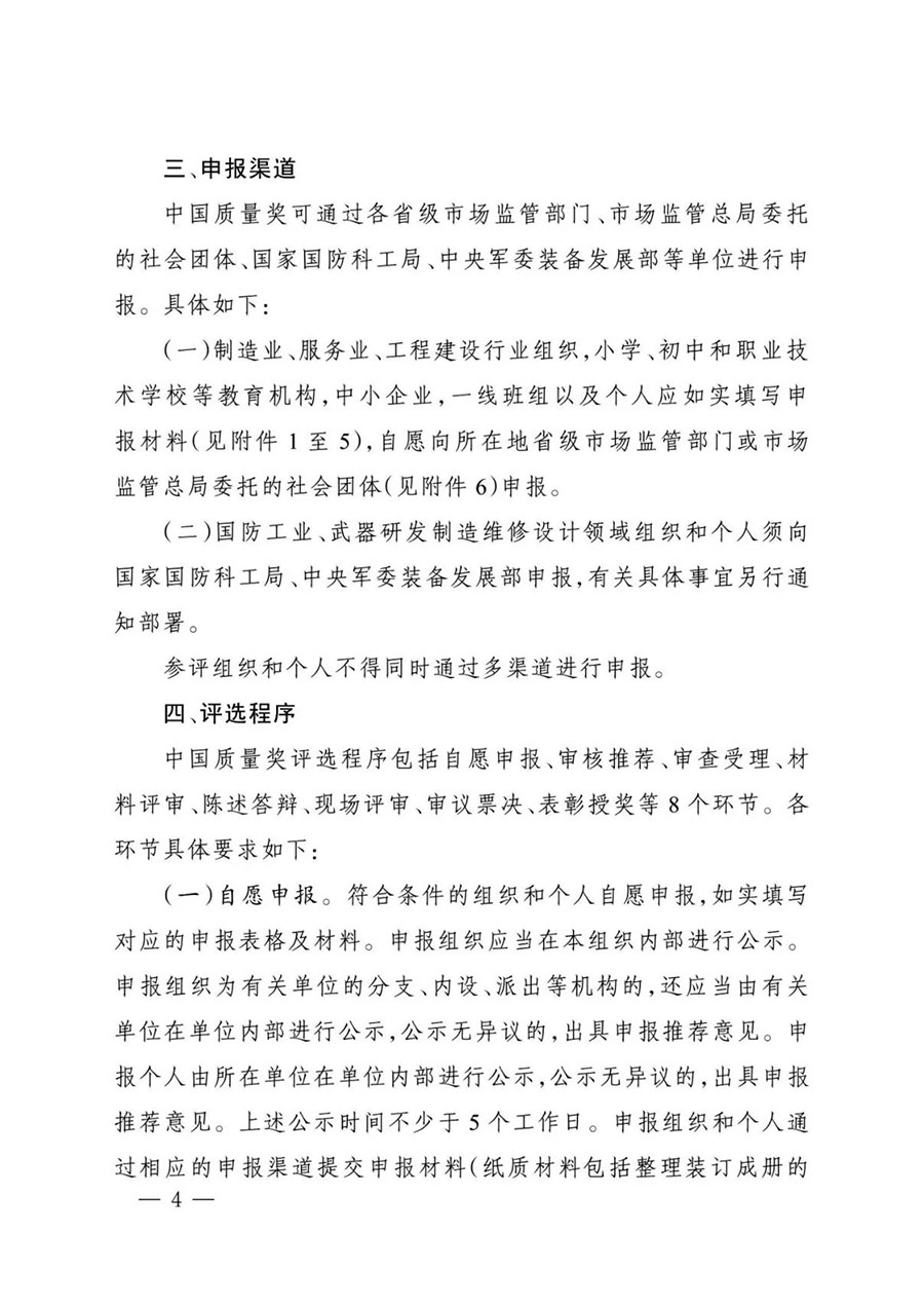 (三)嚴守紀律要求。參與評選工作的有關(guān)單位、專家和工作人員要始終堅守科學(xué)、公正、公平、公開的原則,恪守工作紀律,嚴格遵照程序開展工作。嚴禁從事任何影響評選公正性的活動,不得以任何方式向參評對象收費或變相收費、搭車收費。中國質(zhì)量獎評選不面向參評對象開展任何形式的創(chuàng)獎培訓(xùn)、咨詢等活動,任何組織和個人不得借中國質(zhì)量獎評選機構(gòu)名義牟取利益。中國質(zhì)量獎監(jiān)督分委員會將對評選工作進行全方位全過程監(jiān)督。