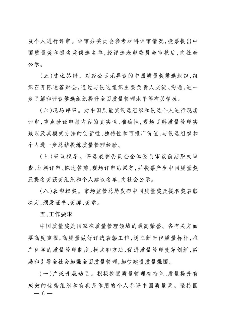 為全面貫徹黨的二十大精神,落實《質(zhì)量強國建設(shè)綱要》部署,根據(jù)中央批準設(shè)立中國質(zhì)量獎有關(guān)要求和《中國質(zhì)量獎管理辦法》規(guī)定,市場監(jiān)管總局決定組織開展第五屆中國質(zhì)量獎評選表彰工作?,F(xiàn)將有關(guān)事項通知如下: