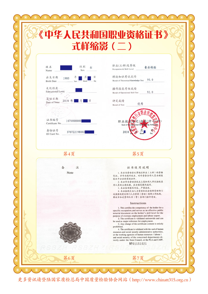 參加我會(huì)組織的培訓(xùn)并經(jīng)考試、鑒定合格者,將由(國家質(zhì)量監(jiān)督檢驗(yàn)檢疫總局)質(zhì)量技術(shù)監(jiān)督行業(yè)職業(yè)技能鑒定指導(dǎo)中心頒發(fā)中華人民共和國勞動(dòng)和社會(huì)保障部印制的《中華人民共和國職業(yè)資格證書》(初級(jí)、中級(jí)、高級(jí))。《中華人民共和國職業(yè)資格證書》既是從事相關(guān)檢驗(yàn)崗位人員所具備的職業(yè)技術(shù)要求和職業(yè)技能水平的資格憑證,也是用人單位技能人才評(píng)價(jià)、招收錄用和確定技能人才工資待遇的主要依據(jù),還是我國公民境外就業(yè)和輸出勞務(wù)具備法律效力公正的國家級(jí)有效證件(可應(yīng)學(xué)員要求頒發(fā)英文版本的證書)。