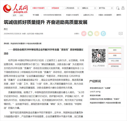 人民網(wǎng):筑誠信抓好質(zhì)量提升 齊奮進(jìn)助高質(zhì)量發(fā)展——質(zhì)檢協(xié)會(huì)攜手2000家優(yōu)秀企業(yè)開展2020年全國“質(zhì)量月”質(zhì)量誠信倡議活動(dòng)