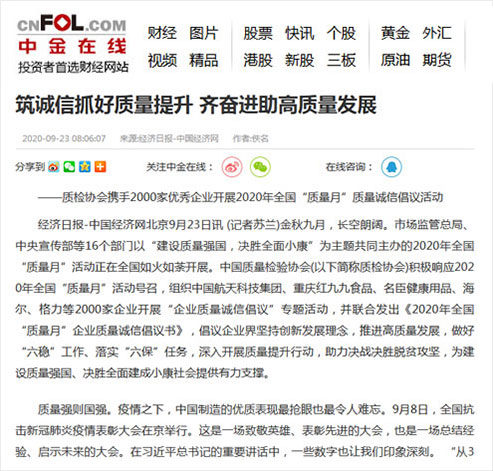 中金在線:筑誠信抓好質(zhì)量提升 齊奮進(jìn)助高質(zhì)量發(fā)展——質(zhì)檢協(xié)會(huì)攜手2000家優(yōu)秀企業(yè)開展2020年全國“質(zhì)量月”質(zhì)量誠信倡議活動(dòng)