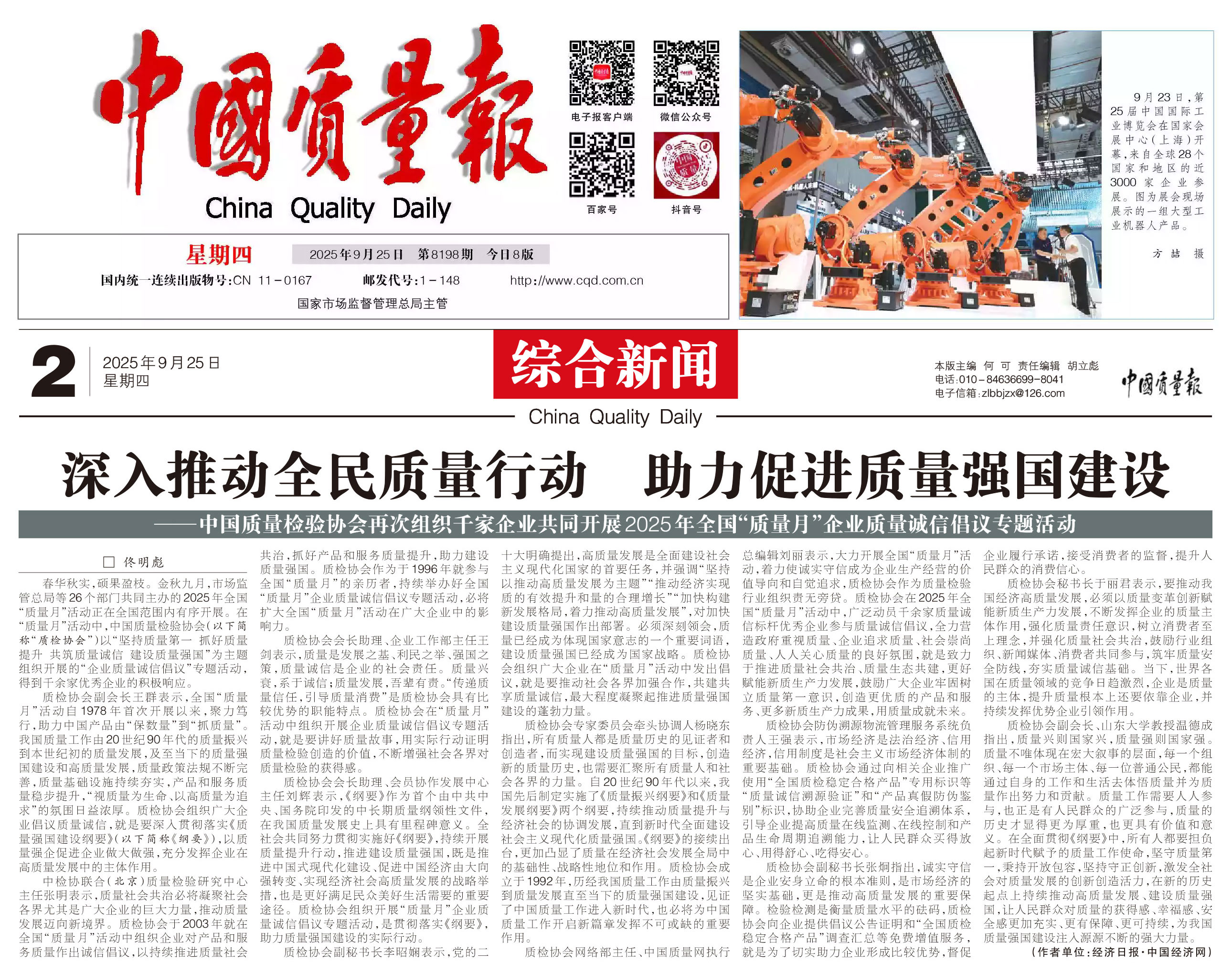- 《中國質量報》(2025年9月25日刊)發(fā)布:深入推動全民質量行動 助力促進質量強國建設——中國質量檢驗協會再次組織千家企業(yè)共同開展2025年全國“質量月”企業(yè)質量誠信倡議專題活動