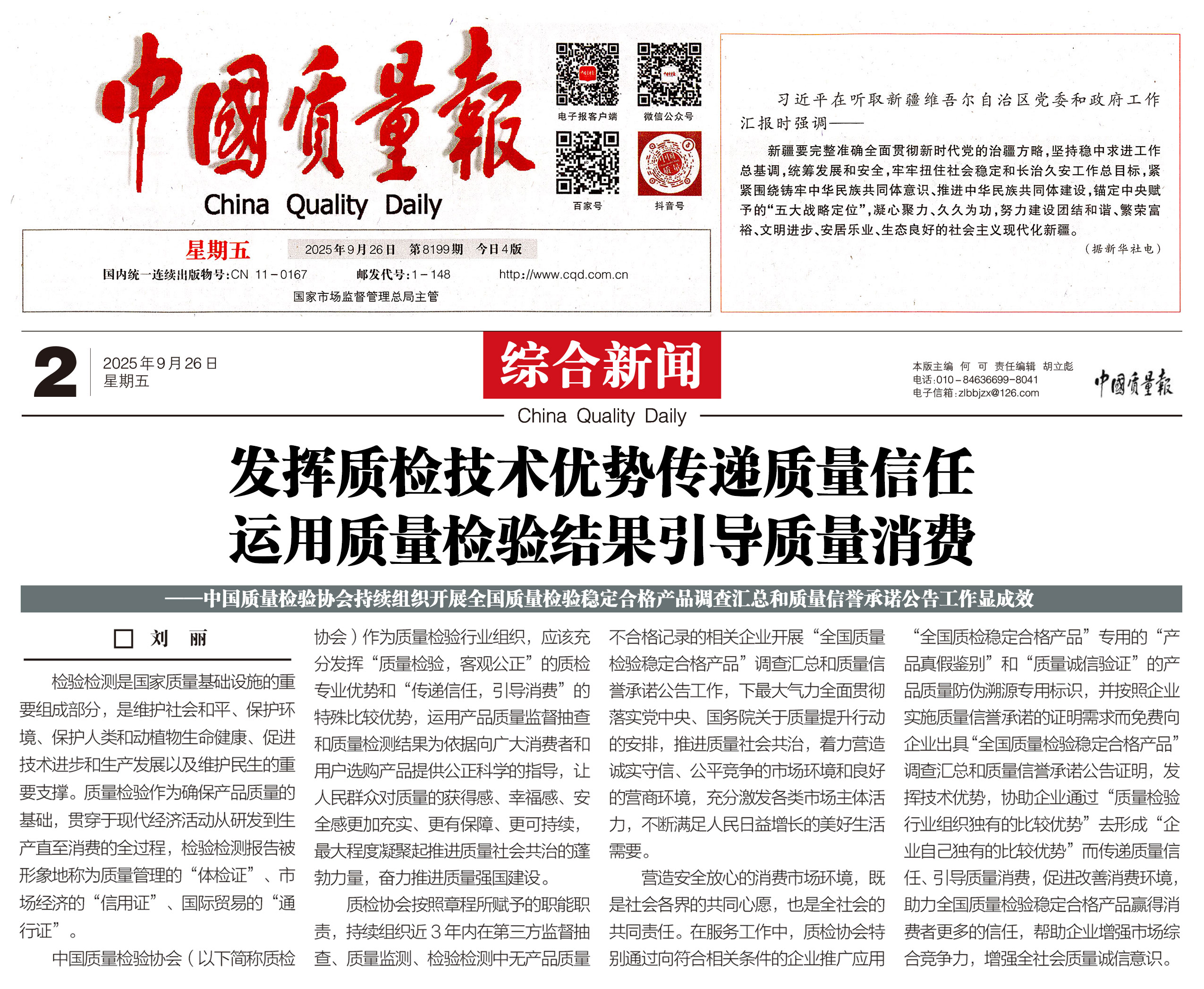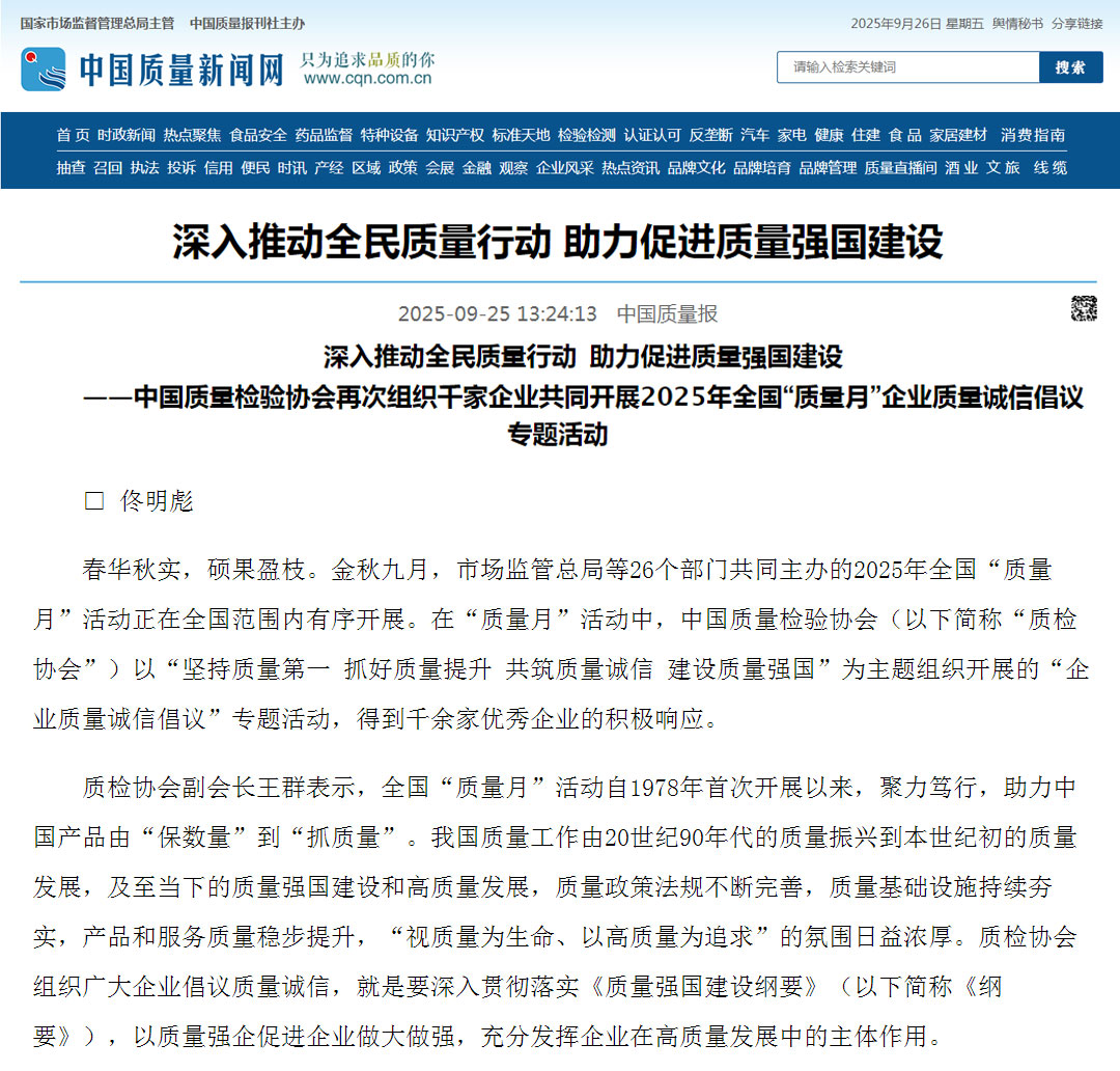 - 《中國質量報》(2025年9月25日刊)發(fā)布:堅持質量第一 抓好質量提升 共筑質量誠信 建設質量強國——2025年全國“質量月”企業(yè)質量誠信倡議書(2025年9月·北京)