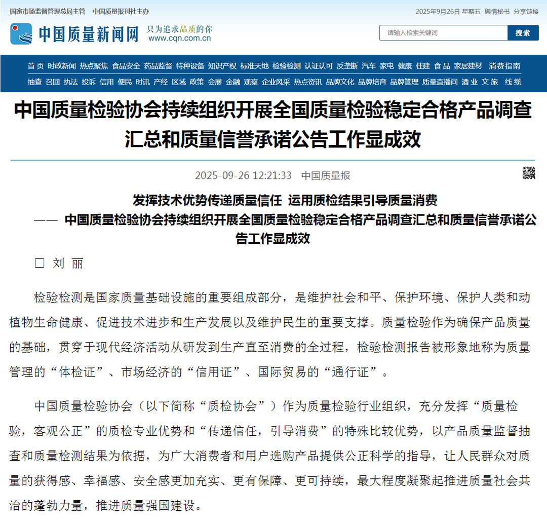 - 《中國質量報》(2025年9月26日刊)發(fā)布:發(fā)揮技術優(yōu)勢傳遞質量信任 運用質檢結果引導質量消費————中國質量檢驗協會持續(xù)組織開展全國質量檢驗穩(wěn)定合格產品調查匯總和質量信譽承諾公告工作顯成效